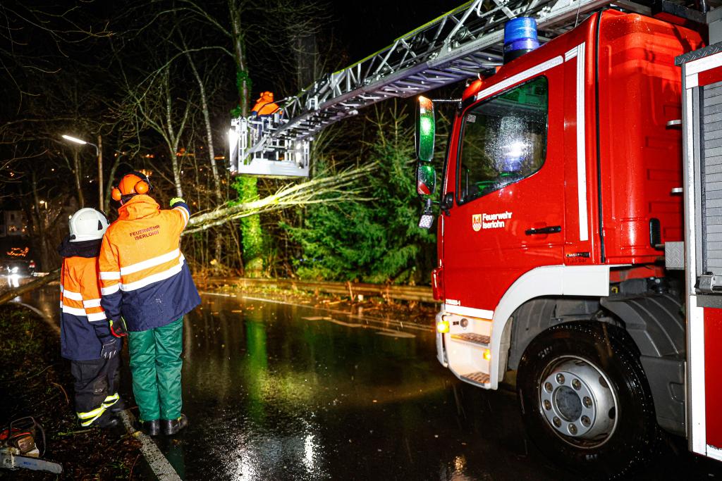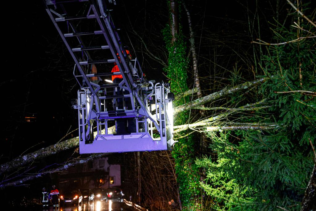 Mit der Drehleiter wurden die Bäume entfernt. Die Straße wurde abschließend gereinigt.