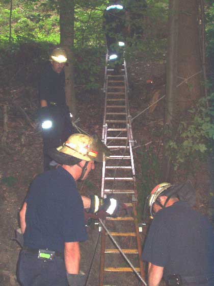 Die verunfallte Person wurde auf der Trage fixiert und vom Unfallort über die 4teilige Steckleiter zum LF transportiert.