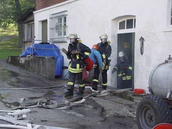 Zwei Trupps der LG21 drangen von der Ost-Seite durch eine Kellertür in das Objekt vor und machten sich auf die Suche nach den Vermisten Personen. Zeitgleich nahm die LG25 über Steckleiter von der Nordseite her einen Innenangriff vor und suchte ebenfalls nach den vermißten Personen im Obergeschoß. Ein weiterer Trupp nahm ein C-Rohr für den Außenangriff vor, da ein Durchbrennen der Dachhaut angenommen wurde.