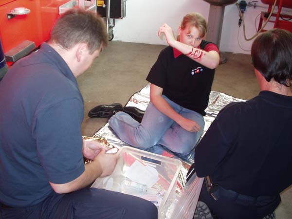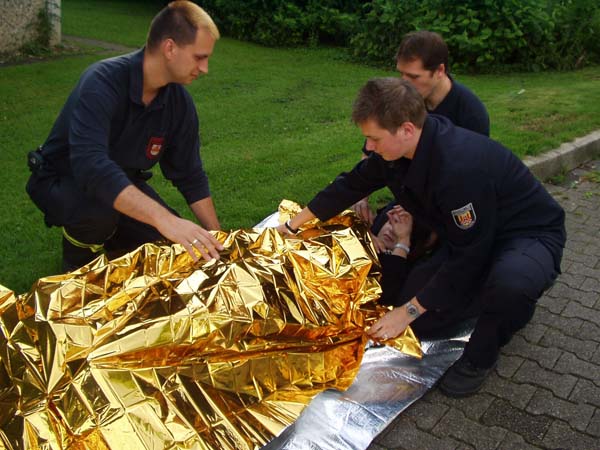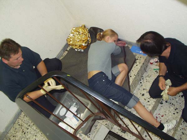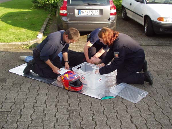 Das DRK hat 5 Stationen aufgebaut, bei denen verschiedene Unfall-Situationen gespielt wurden. Jeder Gruppe stand ein Packet mit verschiedenstem Verbandsmaterial zur Verfügung um die realistisch wirkenden Verletzungen zu versorgen.