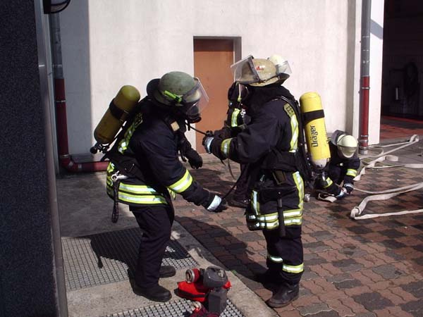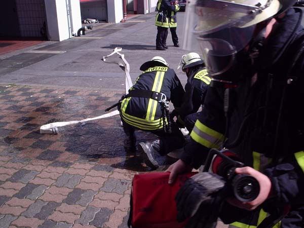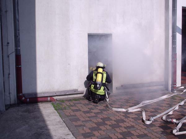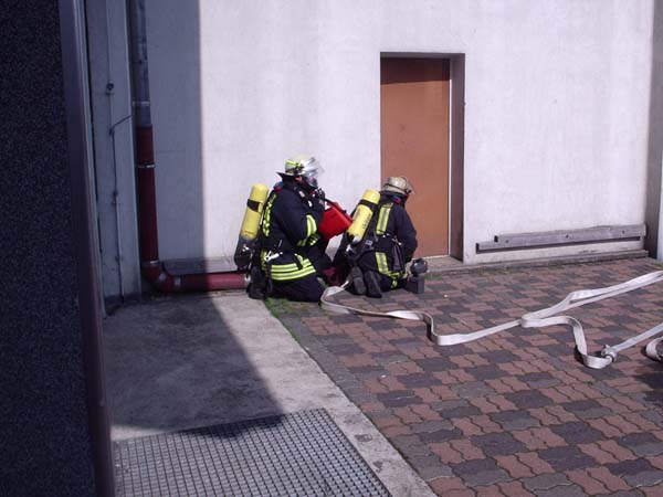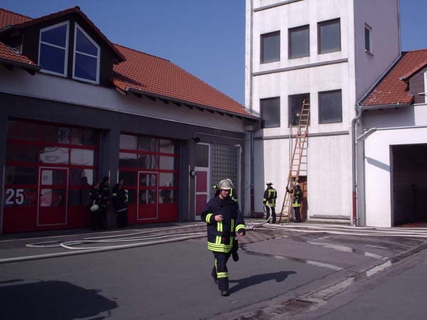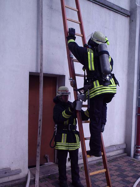 Hier wird dann eine qualifizierte Menschenrettung über 2 unterschiedliche Angriffswege durchgeführt. Der 1. Weg führt über das Treppenhaus; der 2. Weg von außen über tragbare Leitern.