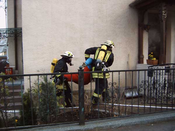 Zwei Personen wurden mittels Fluchthaube von den eingesetzten Trupps ins Freie gebracht. Ein Mann und zwei Kinder wurden aus der zweiten Etage des Gebäudes mit Hilfe der Drehleiter in Sicherheit gebracht.