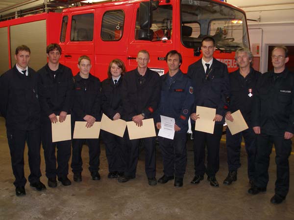 Auf den Tagesordnungspunkten standen unter anderem Beförderungen und Ernennungen. So wurden Rolf Closson und Jens Bode zum Feuerwehrmann, Stephanie Reinwald zur Feuerwehrfrau, Andre Laucht zum Unterbrandmeister und Marco Grosjohann zum Hauptbrandmeister befördert. Frank Schneider wurde zum stellv. Löschgruppenführer ernannt und erhielt gleichzeitig noch nachträglich das Feuerwehr-Ehrenabzeichen für 25 Jahre Dienst in der Feuerwehr.