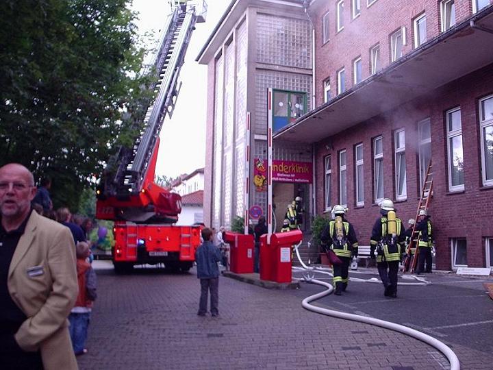 Die Ausgangslage war ein Brand in der Küche der Kinderstation. Mehrer Personen waren noch im Gebäude und wurden über Steckleitern und im Innenangriff gerettet. Eine Person wurde mit der Drehleiter vom Dach des Gebäudes gerettet, weil der Fluchtweg über das Treppenhaus verraucht war.