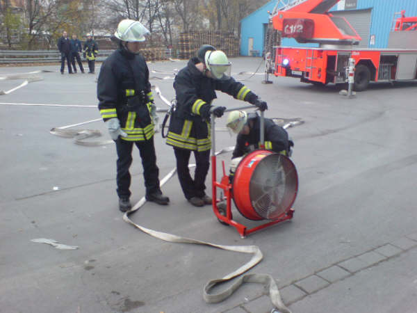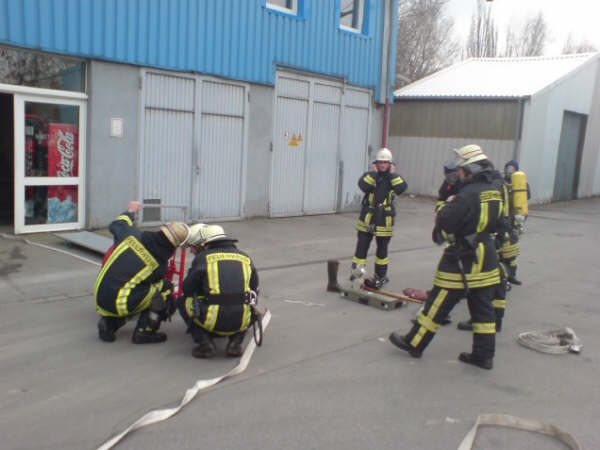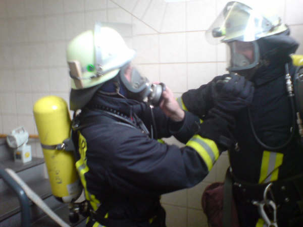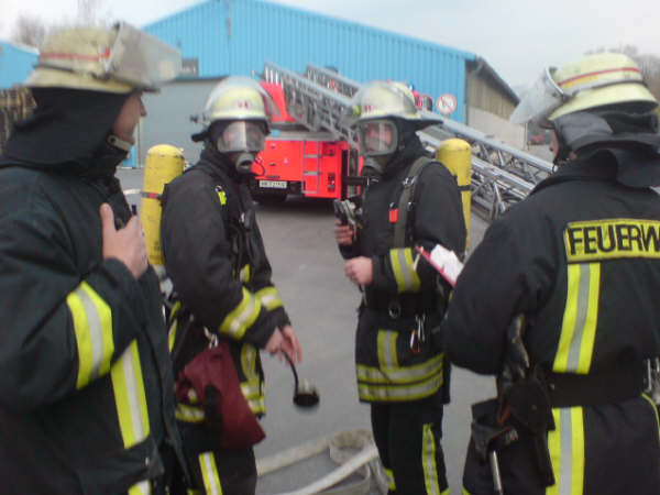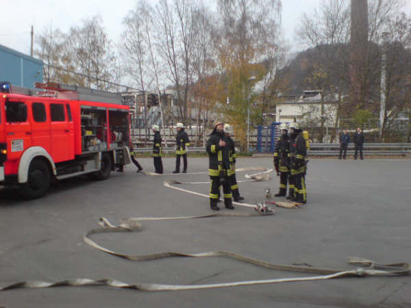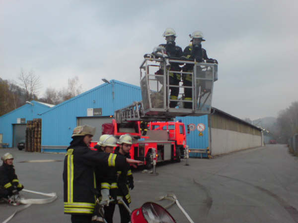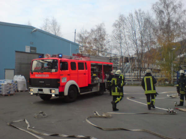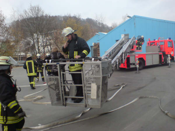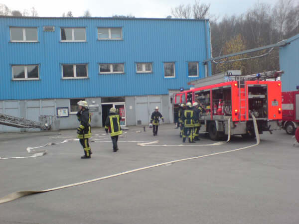 Am Samstag, den 17.11.2007, führte die Löschgruppe Letmathe ihre diesjährige Jahresabschlußübung durch. Angenommene Lage war ein Brand in den Umkleideräumen des Chemiekonzern Hexion im 2. Obergeschoß. Es wurden 2 Personen als vermißt gemeldet. Beim eintreffen am Übungsobjekt war eine starke Rauchentwicklung zu erkennen ,eine Person stand am Fenster und schrie um Hilfe. Sofort wurde die Rettung der Person über die DLK eingeleitet. Ein Trupp unter PA ging über das Treppenhaus zur Menschenrettung mit einem C-Rohr vor.Es wurde eine Person (ein Dummy) dann über das Treppenhaus gerettet.Ein weiterer Trupp unter PA stieg dann über die DLK mit dem 2 C-Rohr ins Gebäude ein .Nachdem das Gebäude kontrolliert war und Abluftöffnungen geschaffen waren,wurde das Gebäude mittels Lüfter vom Rauch befreit. Alles in allem war es eine durchaus gelungene Übung.