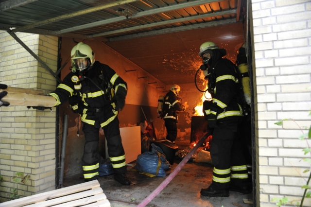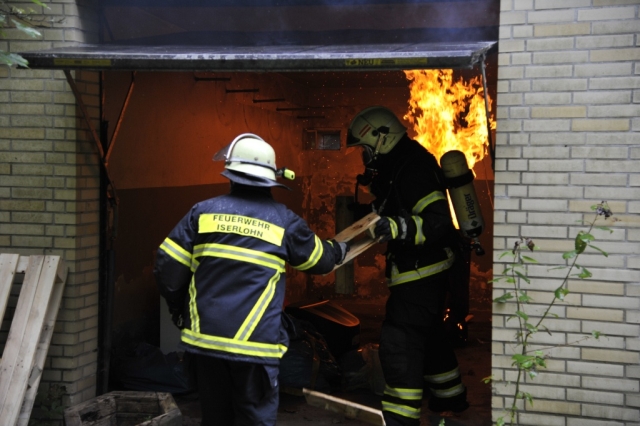 Bei der ersten Einsatzübung wurde ein Garagenbrand simuliert. Die Garage hatte einen direkten Zugang zu einem Einfamilienhaus. Um die Übung so realitätsnah wie möglich zu gestalten, wurde in der Garage ein Holzfeuer entzündet. Brandrauch zog durch das Wohnhaus und bedrohte drei vermisste Personen im Gebäude und eine Person auf einem rückwärtigen Balkon. Mehrere Atemschutztrupps wurden zur Menschenrettung durch die Haustür und über Leitern eingesetzt. Zum Einsatz kam auch die Drehleiter. Nach erfolgreicher Rettung nahmen die Einsatzkräfte die Brandbekämpfung in der Garage auf. Hierbei wurde eine Wärmegewöhnung durchgeführt und der Umgang mit dem Hohlstrahlrohr trainiert.