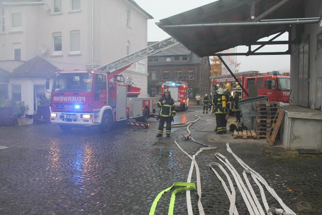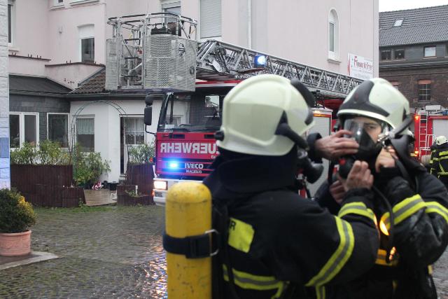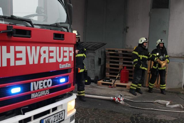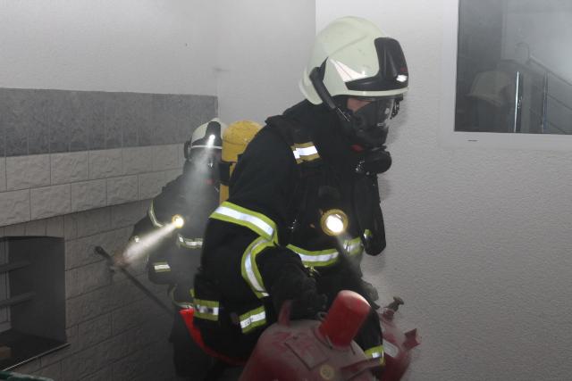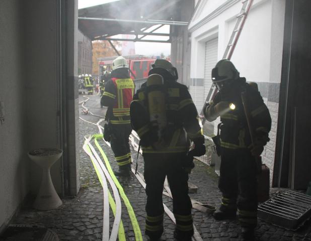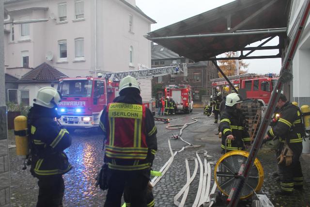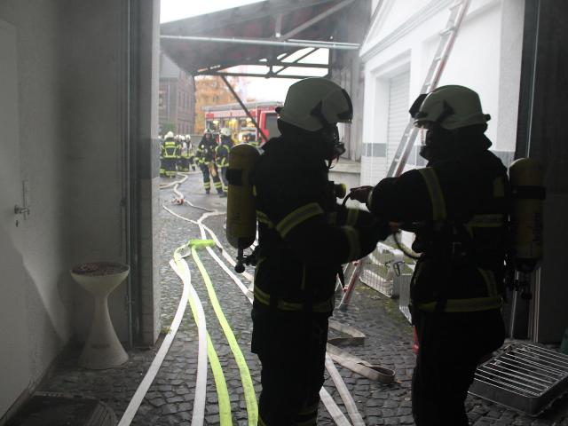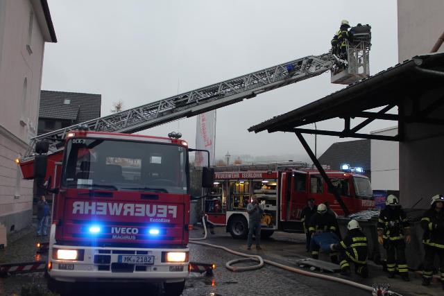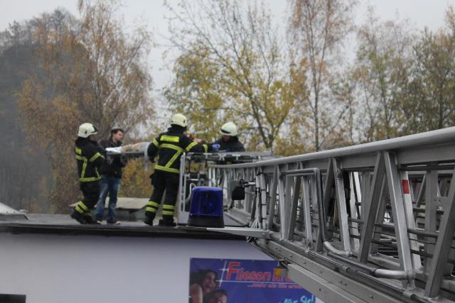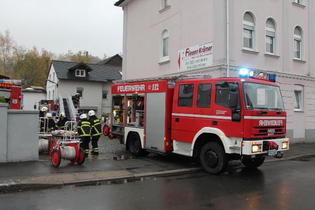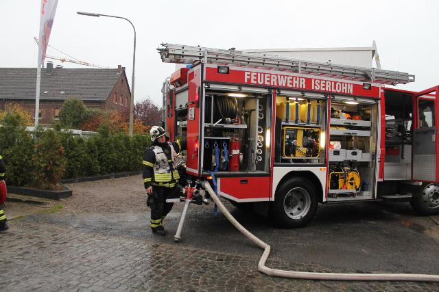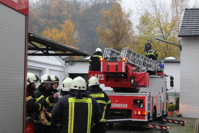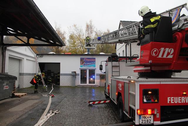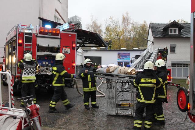 Zur Jahresabschlussübung rückte die Löschgruppe Letmathe am vergangenen Samstag in den Ortsteil Genna aus. Brandinspektor Jörg Krumme hatte für seine Einheit einen simulierten Kellerbrand bei der Firma Fliesen Krämer GmbH & Co. KG vorbereitet. Hierbei erbrachte die erste Erkundung,dass eine Person sich noch in den weitläufigen Kellerräumen des Fliesenhändlers befinden muss. Auf dem Dach waren zum Zeitpunkt des Brandausbruches noch Mitarbeiter mit Dacharbeiten beschäftigt. Durch den plötzlich ausgebrochenen Brand kam Panik auf, ein Mitarbeiter stolperte und brach sich ein Bein. Er musste mit Hilfe der Drehleiter vom Dach gerettet werden. Während dessen gingen mehre Atemschutztrupps in den verrauchten Kellerräumen vor. Die dort vermisste Person konnte in dem Hinterteil des Kellers gefunden und gerettet werden. Bei der Suche wurden mehrer Gasflaschen gefunden und ins Freihe gebracht.