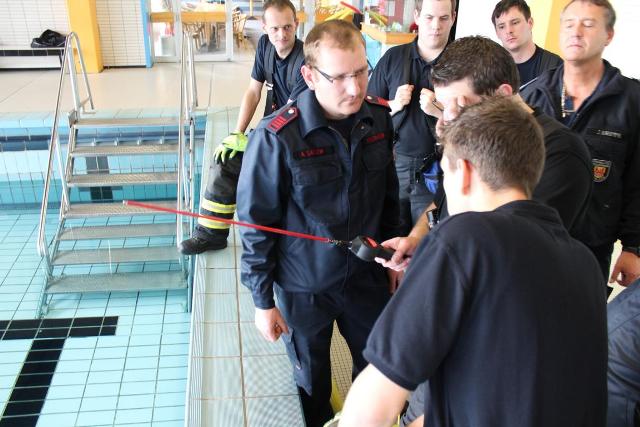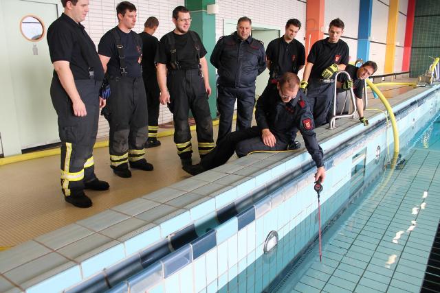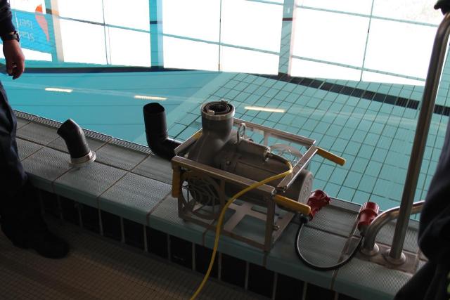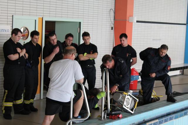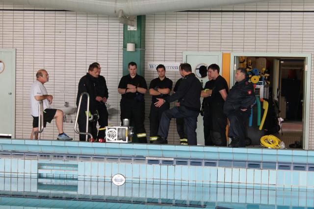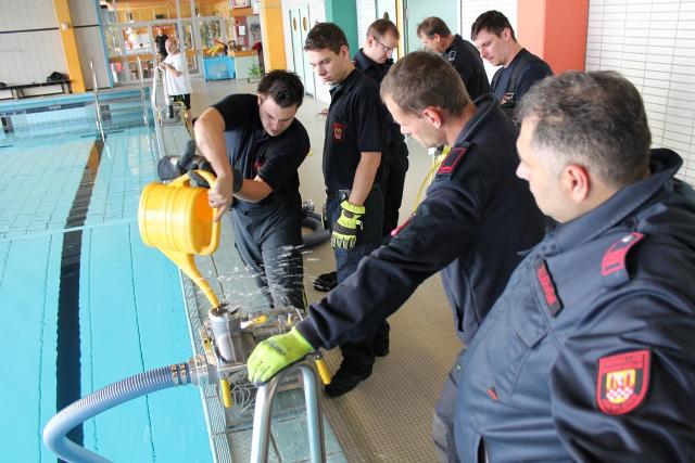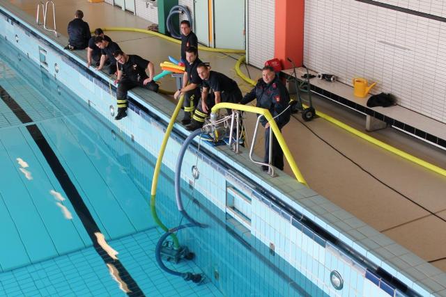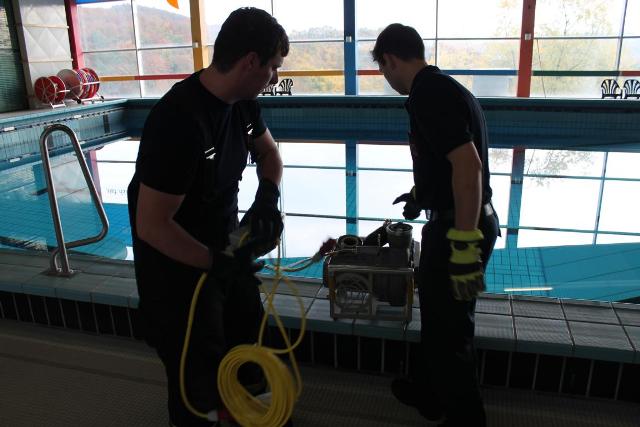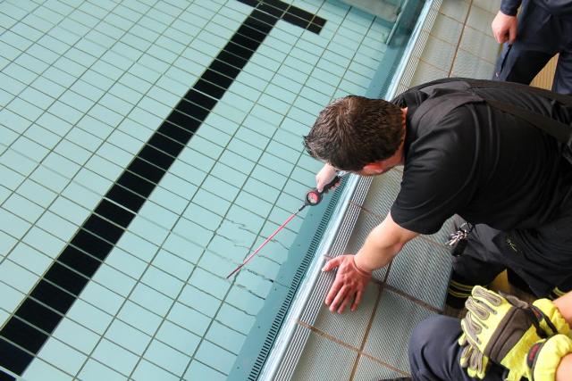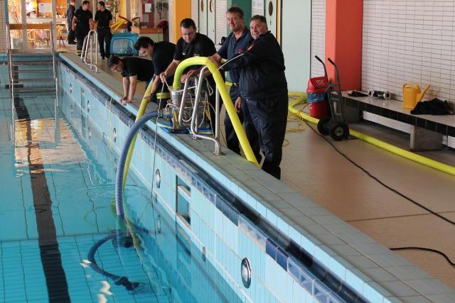 Die geplante Aquamathe-Sanierung des Schwimmbads an der Aucheler Straße, nutze die Löschgruppe Letmathe am Sonntagmorgen für eine Ausbildung. Hier wurde Umgang mit zwei „Chiemsee Pumpen“ der Feuerwehr Iserlohn getestet. Diese beiden Hochleistungspumpen ließen den Beckeninhalt, von rund 1 Million Liter Wasser rasant schrumpfen. Jede der zwei „Chiemsee Pumpen“ hat eine Leistung von 1553 Liter in der Minute. Bei der Wasserfördermenge von ca. 3000 Liter in der Minute konnte man dem sinkenden Wasserspiel deutlich wahrnehmen. Während des abpumpen des Schwimmbeckens, übte die Löschgruppe den praktischen Umgang mit dem Spannungsprüfer, für den Überfluten Bereich. Die Feuerwehr Iserlohn verfügt auf jedem ihrer Löschfahrzeugen über einen Spannungsprüfer. Dieser dient zum Eigenschutz. Hiermit wird zum Beispiel, in einem überfluteten Keller, eine Spannung Freimessung durchgeführt. Somit wird das Wasser kontrolliert, ob es keine Spannung der Hauselektroinstallation mit sich führt.