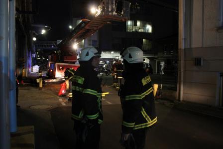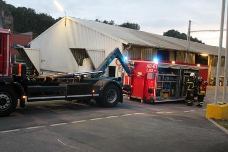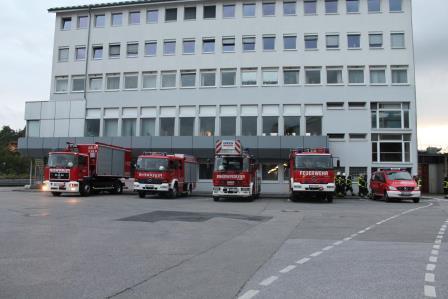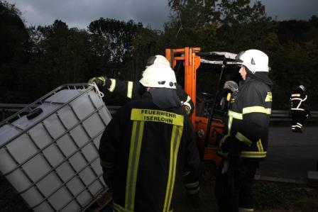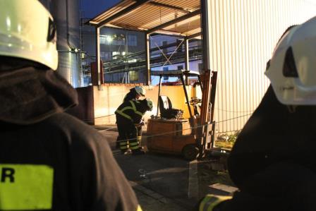 Ein Brandausbruch in einem Verwaltungsgebäude und ein Verkehrsunfall mit einem Gabelstapler, waren das Übungsszenario der Löschgruppen Letmathe und Stübbeken. Am Freitagabend rückten die Einheiten hierzu zur Hexion Specialty Chemicals Holding Germany GmbH in Letmathe Genna aus. Durch die ansässige Werkfeuerwehr erfolgte vor Übungsbeginn eine Arbeitssicherheitseinweisung. Die Gegebenheiten für die Übung stellten sich so da: Ein Gabelstaplerfahrer bemerkte das Rauch aus einem Verwaltungsgebäude kam. Dadurch verlor er die Aufmerksamkeit über seinen Fahrweg und fuhr einen angenommenen Kollegen an. Bei der Kollision rutschte der IBC Behälter von der Gabel und klemmte den Arbeiter darunter ein. Nach der Erkundung der Gruppenführer wurde der Abschnitt Menschenrettung, Brandbekämpfung und Technische Rettung eingerichtet. Im brennenden Gebäude befanden sich noch Personen. Die Hilfeschreie eines Angestellten an einem Fenster führten dazu, dass die Drehleiter in Stellung gebracht wurde und der Betroffene über die Leiter gerettet wurde. Zeitgleich wurde die Wasserversorgung aufgebaut und Trupps gingen unter Atemschutz ins Gebäude vor. Hier war es möglich, dass sich noch mehr Personen im Gebäude befanden. In der zwischen Zeit wurde vom Abrollbehälter Rüst Technisches und Hydraulisches Rettungsgerät vorgenommen, um den eingeklemmten Arbeiter zu retten. Nach dem anheben des Intermediate Bulk Containers, konnte der Arbeiter aus seiner Situation befreit werden und wurde dem Rettungsdienst übergeben. Im Brandobjekt wurde, durch die Atemschutztrupps der weitere vermisste Angestellte gefunden und ins Freie gebracht. Der Brandherd wurde mit einem C-Hohlstrahlrohr abgelöscht. Um das Gebäude von der noch vorhandenen Verrauchung durch die Nebelmaschine zu befreien wurde der Überdrucklüfter eingesetzt und die Übung beendet. Die Nachbesprechung, am Gebäude der Werkfeuerwehr ergab, dass die verfolgten Übungsziele erreicht worden sind. Somit rückten die Einheiten gegen 21:00 Uhr zum Standort am Lennedamm ein.