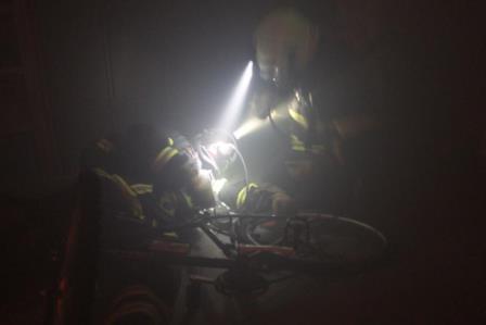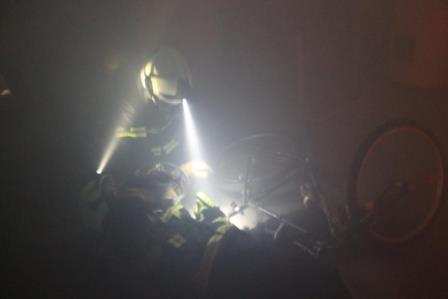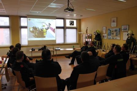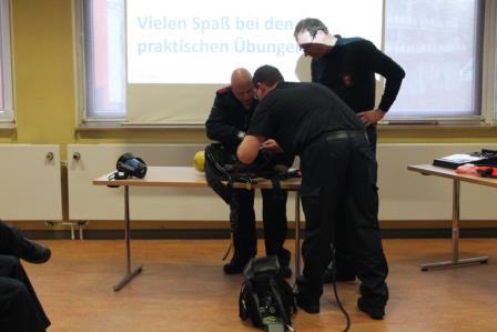 Nach einer theoretischen PowerPoint Schulung, bei der von Thomas Fischer auf den Sicherheitstrupp und die Atemschutzüberwachung (ASÜ) eingegangen worden ist, wurde im Anschluss das geschulte praktisch umgesetzt. Hierfür begaben sich die Feuerwehrleute in die Fahrzeughalle und rüsteten sich mit Atemschutz aus. Schulmäßig wurde das Retten eines verletzten Feuerwehrkameraden nach einem Unfall geübt. In der Zwischenzeit präparierte Thomas Fischer, der den Dienstabend leitete, den Keller mit Diskonebelgenerator, Brandgeräuschsimulator und einem Flammeneffekt Licht. Zum Abschluss des Übungsabends wurde ein Atemschutztrupp in den Keller geführt, wo einer einen verletzten Feuerwehrmann simulierte. Für die restlichen Trupps galt es nun, den verunglückten Kammeraden zu retten. Bei der lauten Geräuschkulisse und bei fast null Sicht durch den Nebel war dieses nicht gerade ein leichtes Unterfangen. Dennoch konnte der verunglückte Atemschutzgeräteträger schnell und schonend aus seiner misslichen Lage gerettet werden.