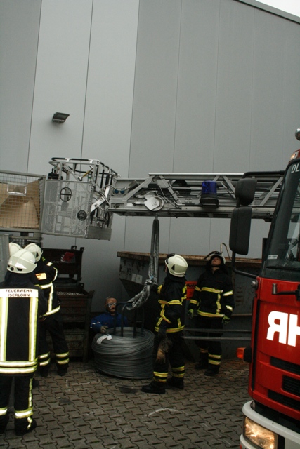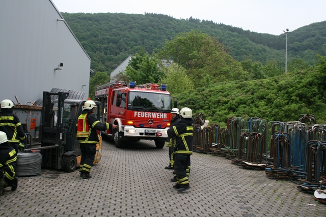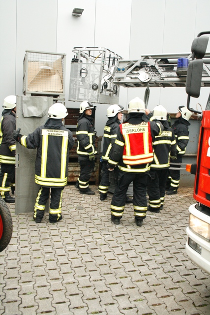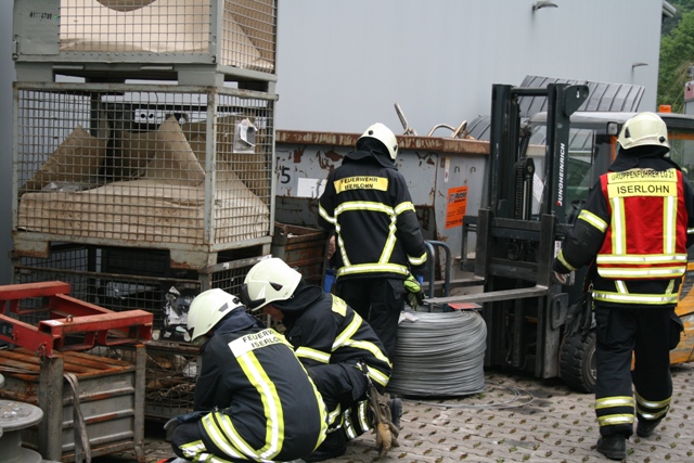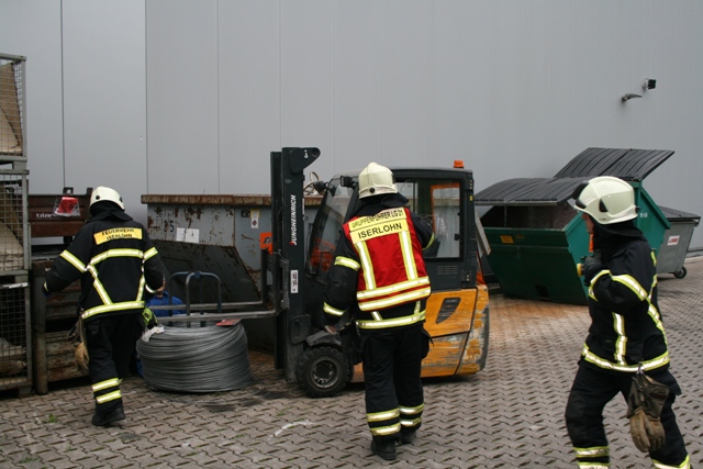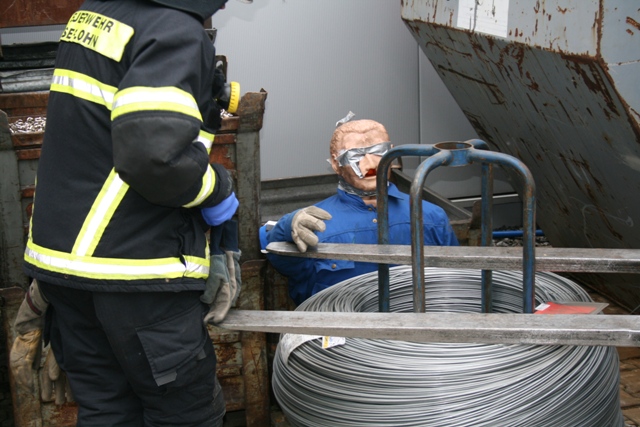 Angenommene Lage war ein Betriebsunfall mit einer eingeklemmten Person bei der Firma Blanke in Stenglingsen. Beim rangieren eines Gabelstapler auf dem Betriebsgelände wurde eine Person vom Stapler erfasst und unter einer Drahtrolle eingeklemmt. Der Fahrer des Staplers war unter Schock weggelaufen und hatte den Zündschlüssel abgezogen und mitgenommen. Die erste Maßnahme war ,dass die Person Rettungsdienstlich versorgt wurde. Der Stapler wurde von den Einsatzkräften zurückgeschoben. Die Drehleiter wurde als Kran in Stellung gebracht , die Drahtrolle wurde angehoben so das die Person befreit werden konnte.