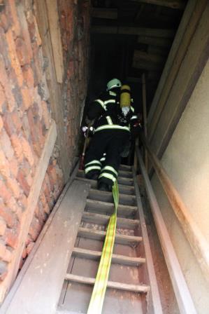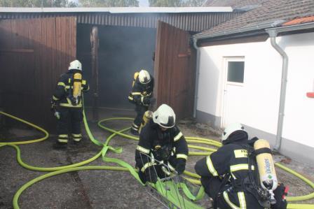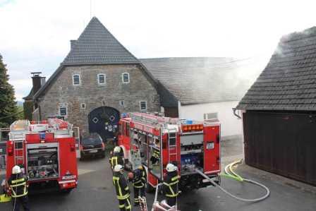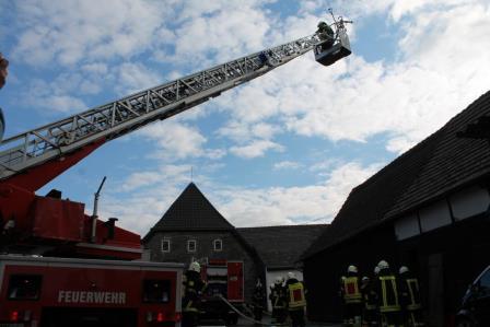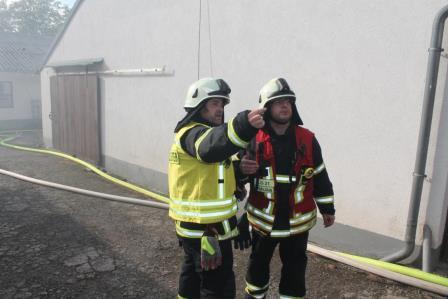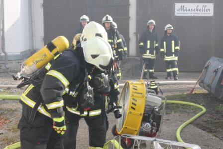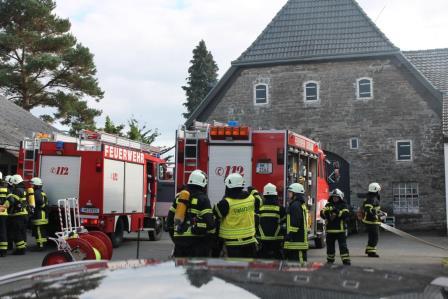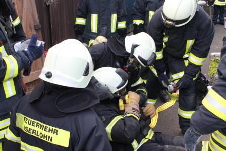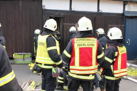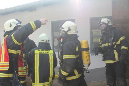 Zu diesem Zweck trafen sich die Einheiten am 08. Oktober um 15:00 Uhr am Gerätehaus am Lennedamm. Zugführer Brandoberinspektor Ingo Dahmen übernahm die Begrüßung des Löschzugs West und übergab die Einsatzleitung an Christian Braun, der in Zukunft einen Zugführer-Lehrgang (F IV) beim Institut der Feuerwehr in Münster besuchen möchte. Da der Zugführer den Übungsablauf beobachten wollte, fuhr dieser zum Übungsobjekt vor. Auf einen Bauernhof auf dem Schälk setzte er zwei Nebelmaschinen ein und verrauchte zwei Gebäudeteile des Bauernhof Komplexes. Dem nun eintreffenden Einsatzleiter Christan Braun bot sich ein Szenario bei dem dichter Rauch aus den Dachziegeln aufstieg und aus einem seitlichen Scheunentor, deutlich erkennbar, ebenfalls Rauch hervorstieß. Da in dem Teil des Bauerhofes noch Mitarbeiter vermutet wurden, gab der Einsatzleiter den Befehl mehrere Trupps unter Atemschutz ins Gebäude vorgehen zu lassen. Zeitgleich wurde die Drehleiter der Löschgruppe Letmathe eingesetzt, um mit einem Wenderohr die Dachhaut zu kühlen. Der nächste Hydrant zur Wasserversorgung befand sich auf der anderen Seite des Gehöfts. Hierzu mussten die Feuerwehmänner mehrere 100 Meter Schlauch ausrollen. Die vorgegangenen Atemschutztrupps konnten 6 Dummy Puppen aus den verrauchten Gebäudeteilen retten und befreien. Zum Schluss der Übung wurde noch eingespielt, dass ein Feuerwehrmann, der sich unter Atemschutz unterhalb des Dachstuhls befand, umknickte. Dieses führte zu einer Mayday Lage, der Sicherheitstrupp, sowie ein Trupp, der sich auf dem Rückzug befand, kamen dem verunfallten Feuerwehrmann zur Hilfe. (Ein Atemschutztrupp, der in eine Notfallsituation gerät, setzt den Mayday Funkspruch ab. Dieses löst das Sicherheitstruppkonzept aus.) Mit dem Einsatz des Überdrucklüfters wurden die Gebäudeteile belüftet und der Rauch aus den Räumen verdrängt. Zugführer Ingo Dahmen zeigte sich in der Nachbesprechung im Ganzen mit der Übung zufrieden. Die Fahrzeugaufstellung wurde bewusst nicht nach Einsatzstandards gewählt. Hier wollte man einer notwendigen Sperrung der Bundesstraße entgegenwirken. Seitens der Feuerwehr geht ein großer Dank an die Familie Recke, die uns kurzfristig das Übungsobjekt zur Verfügung gestellt hat. Zum Abschluss organisierte die Löschgruppe Letmathe einen gemütlichen Ausklang, bei dem es Gyros von einem Spieß gab und so konnten die Feuerwehrmänner sich noch einige Stunden austauschen.